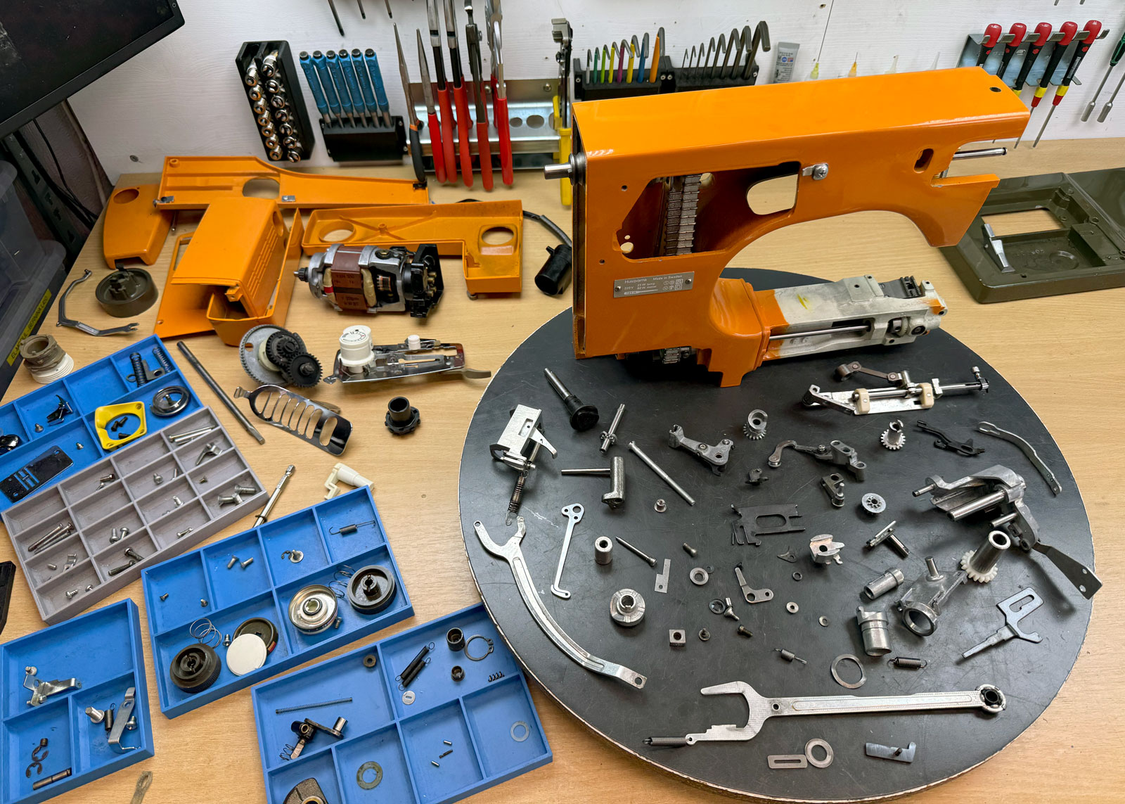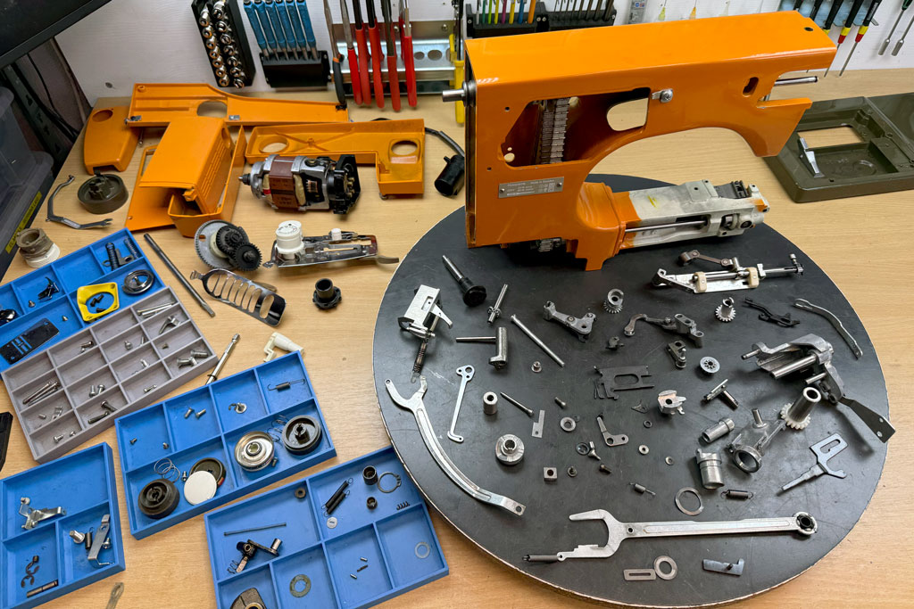 Symaskinen demonteres så langt det er nødvendig. Mekaniske deler tas helt fra hverandre, og tannhjul og komponenter vaskes grundig i ultralydvasker – samme type utstyr som brukes på bilverksteder, hos urmakere og gullsmeder for å fjerne olje, fett og smuss.
